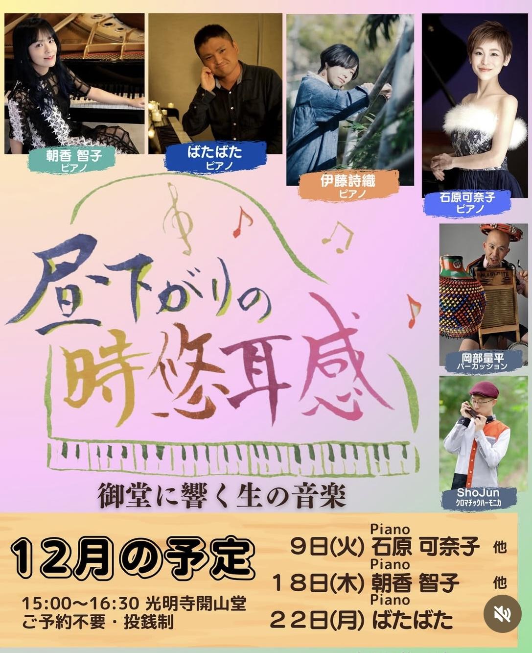 日時:12月9日(火)15:00〜16:00(ピアノソロ)、16:00〜16:20(ピアノ&クロマチックハーモニカ)